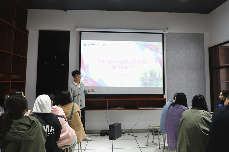 推优会后,左戈主持开展了“防传销防非法集资进校园”主题会议。他先以“非法集资”为例,向同学们简单地介绍了“经济犯罪”的概念,进而引出关注度日益上升的“传销”问题。左戈结合国家出台的相关法律规定,细致详尽地向大家说明了传销和非法集资的危害性,引导员工树立正确消费观念。