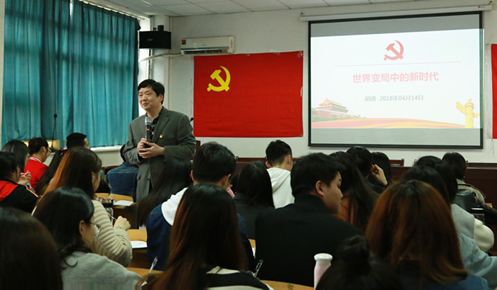 典礼结束后,胡靖以《世界变局中的新时代》为题为本次党课班开讲。他以互动的方式拉开教学帷幕,接连向同学发问,十九大的精神是什么?初心与使命是什么?一番考核后,他以美英法发起了对叙利亚战争和博鳌论坛等近期热点事件为切入点,用“美国乱了,世界慌了”、“一场选举,两次革命”、“政治斗争,物质基础”、“美国治理,中国印记”、“走自己的路,让别人闹去吧”等五个新颖的章节标题,结合马克思的原著,讲述了世界的故事、中国的故事、党的故事,深入浅出地揭露了资本主义的真实面目、世界发展的必然规律和当下时代格局的变化。他指出,中国从五四运动开始将会经历五个阶段,进入到现代化强国之后,便会回到历史的新常态,尽管过程会有艰辛,但中国共产党人只要自信与定力,初心与使命,责任与担当,便能走出令世界瞩目的路!
