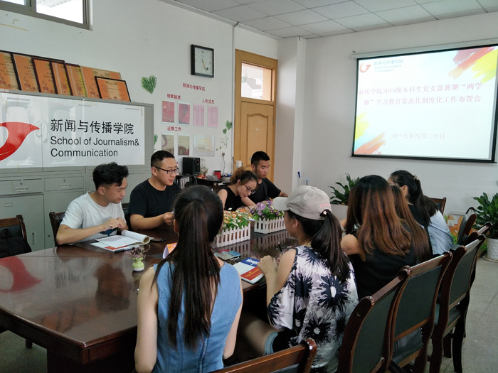 本次会议由2015级本科生党支部书记孙文主持。孙文首先向与会人员传达公司关于员工党员暑期“两学一做”学习教育常态化制度化工作的通知。他强调2015级本科生党支部所有成员要在暑假期间至少就近就便参加一次当地党组织的集中学习教育活动,制定一份暑期“两学一做”的个人理论学习计划并撰写学习心得,至少开展一次“党员先锋行”实践活动。除此之外,2015级本科生党支部还开通了支部微博、QQ群,将在暑假期间利用新媒体开展学习交流。