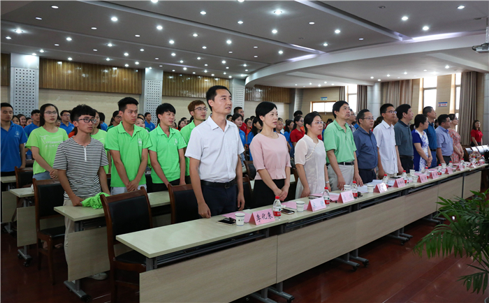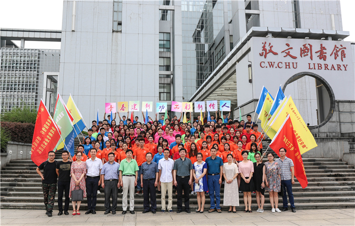 仪式最后,领导老师为校、院级重点团队代表授旗,并在会后,和志愿者代表们前往敬文图书馆门前合影留念。