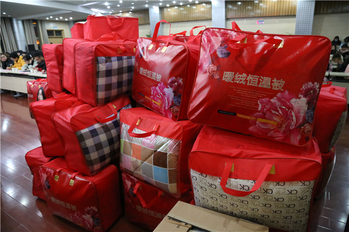 最后,宋静给特困生代表发放了暖冬棉被、各级专业辅导员给同学们发放了暖冬文具。千里送鹅毛,礼轻情意重。即使暖冬物资并不是特别贵重,同学们仍然热情高涨,在发放物资时发出欢呼。每一位特困员工代表在接过老师递来的物资时脸上都洋溢着笑容,向老师及公司表示了真挚的谢意。在老师的引导下,同学们积极有序地上前领取,每个人都领到了属于自己的一份。