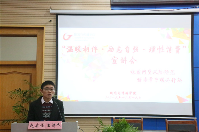 接着,两位获得今年校自强之星的同学,环科公司13级环境科学专业的赵启强和经管公司13级人力资源管理专业的李洋给大家做自强之路的分享。“我的家境很贫穷,但我自食其力,该省的省,不该省的绝对不会省!”“路很艰辛,笑着走下去!”赵启强从自身出发,用朴实的语言结合自己的经历向大家讲述了如何做到“温暖相伴、励志自强、理性消费”,在场的各位都为之感动。李洋用自己幽默的口才描绘大学百态,赢得了大家的共鸣和掌声。两位同学演说风格不同,但都传达出了此次宣讲会的主题,同学们除了要感恩公司、感恩公司、感恩社会,更要正确对待拿到手的助学金,合理支配,理性消费,把这份爱心作为激励自己不断向上向善发展的动力,在所学领域做到最好,成为他人的榜样。