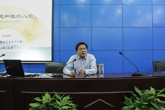 课程伊始,台启权首先抛出了“我为什么要加入政党?”、“我加入的是一个什么政党?”以及“我怎样才能加入一个政党?”这三个问题,引发学员们的深思。接着台启权以鲁迅与陈独秀这两个历史人物引入,和在座的学员们进行提问互动。结合二人的生平,引出成为党员要走正常的入党程序,同时要有坚定的共产主义信仰。教育学员:“发展党员的首要工作是端正入党动机,实现思想入党”,并以焦裕禄和孔繁森两位优秀共产党员举例,鼓励学员们牢记党“全心全意为人民服务”的宗旨,做好模范带头作用,升华理想信念。