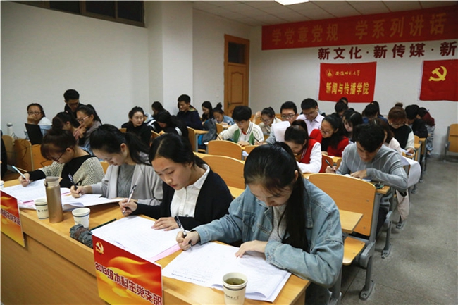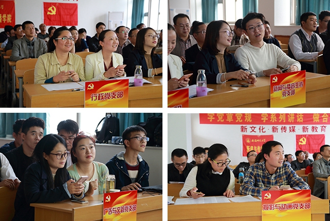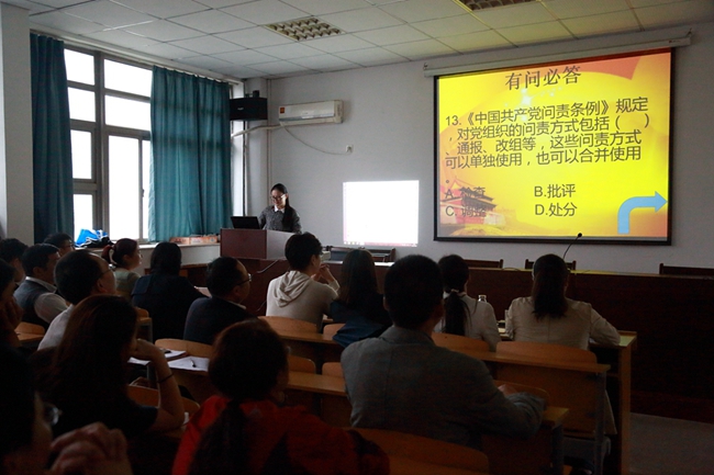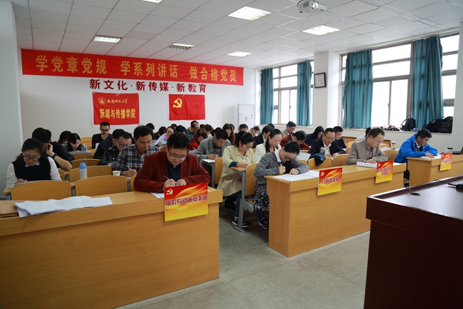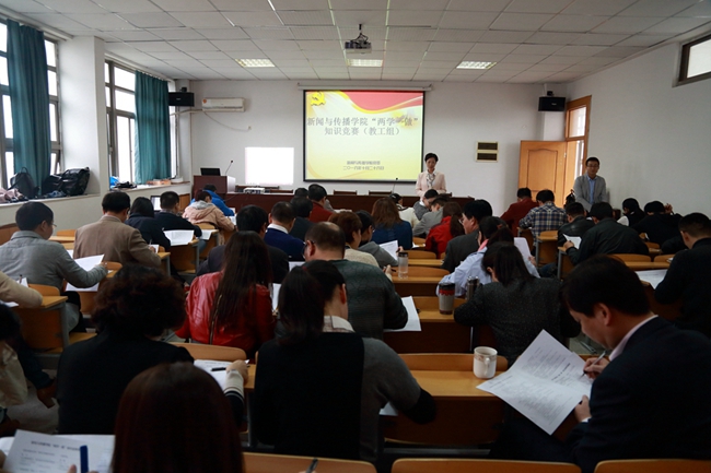 教工组有行政党支部、新闻与播音主持党支部、广告与文管党支部、摄影与动画党支部四支代表队参赛;员工组有2013、2014级本科生党支部、研究生党支部三支代表队参赛。比赛分为两个环节,其中书面知识竞赛所有党员均需参加,现场擂台赛采用必答题、微信抢答等方式,每个代表队由支部推荐2名党员参加,最终得分由支部笔试成绩的平均分与现场答题分相加合成。