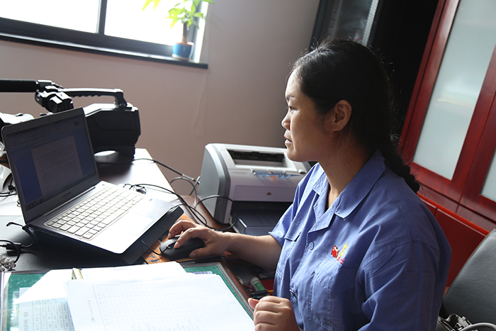 初次见到吴笑梅的时候,她穿着统一的天蓝色工作制服,趴在三楼窗户那儿跟我们打招呼,叫我们快点上楼。拐过三楼的员工工作室,我们终于正式见到了如今身为黄山金仕特种包装材料有限公司任管理者代表、党支部书记兼工会主席的吴笑梅女士。与我们的预初设想不同,她并没有什么特殊、个性的穿着打扮,只和一线工人一样,,连笑容都有种特有的憨厚。