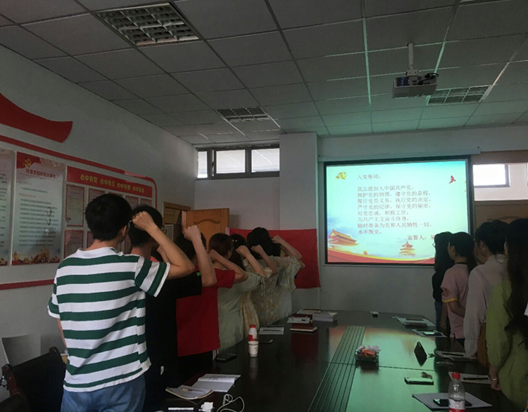 会议开始,全体起立,奏唱国际歌。支部书记高月介绍了会议的流程与内容。领誓人周美霞,面向党旗,带领全体参会党员进行了宣誓。全体参会党员高举右手,庄严宣誓。在庄严洪亮的宣誓声结束后,梁嘉作为新发展的预备党员代表发言,她首先对公司和党组织的培养和照顾表达了深深的感谢,她认为党员不仅仅是一种称号,更象征着一种神圣的责任感,荣誉感和使命感。作为一名员工党员,要加强对党的基本理论知识的学习,提高政治思想素质,积极进取、与时俱进,提高思想入党的觉悟,作为一个共产党人更要有一种奉献精神,做任何事情都不能抱有私心,要更好的为人民服务,更好地奉献社会。随后,支部新发展的预备党员谭海燕、肖梦笛、刘诗捷等同志就未来预期、自身要求等方面发表了自己的看法。高月最后进行了总结讲话,她指出了入党宣誓大会的意义,尤其是对新发展党员的重要性,并在党性学习、思想进步、遵守纪律、提高积极性等方面对他们提出了要求与期望。