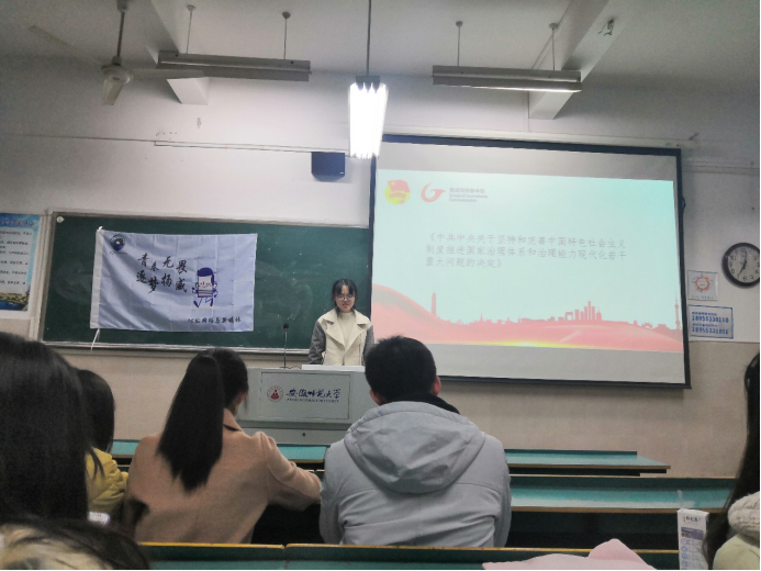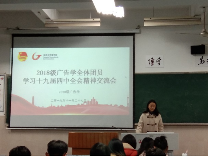 恰逢祖国70华诞,刚刚闭幕的十九届四中全会是为全面建成小康社会、实现第一个百年奋斗目标迈进的关键之年召开的一次会议,充分肯定了我党治理国家取得的历史性成就。从1949到2019,70年风风雨雨,土地革命的实施,朝鲜战争的胜利,社会主义建设的不断推进,以及改革开放的实行,我党始终站在最广大人民群众的立场上,为人民群众谋福祉。2018级的员工作为千禧宝宝,是中国这十几年来快速发展的见证者,对党为人民幸福做出的努力感同身受。11月26日,2018级新闻学在2050402开展了团课学习-十九届四中全会班级精神交流会。11月27日,2018级广告学集体学习了十九届四中全会精神,网新班紧跟其后,于当日晚,举办交流会,共同感触时代脉搏,学习党章知识。