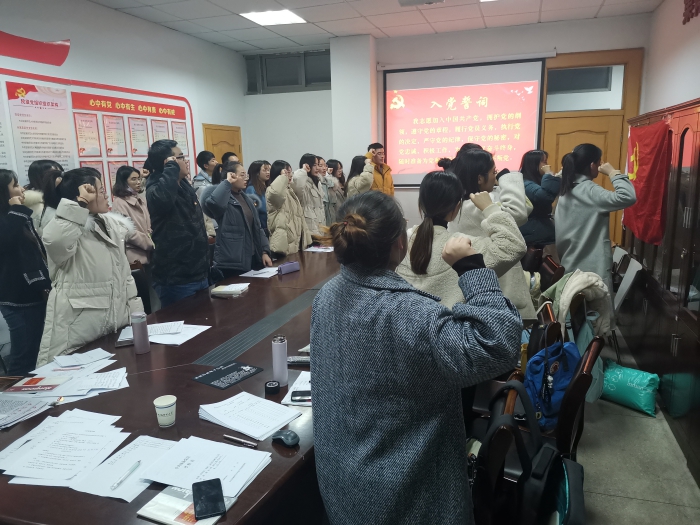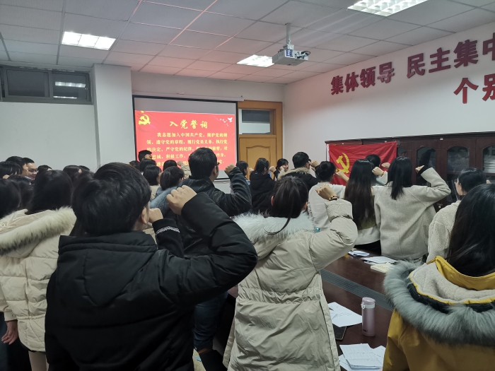 随后,研究生第二党支部与研究生第一党支部联合召开了宣誓大会。与会党员全体起立,奏唱国际歌。领誓人周美霞,面向党旗,带领全体党员进行了宣誓。全体参会党员高举右手,庄严宣誓。在庄严洪亮的宣誓声结束后,彭志全作为参与宣誓的预备党员代表发言,他表示,在面向党旗庄严宣誓时,自己感慨颇多,千言万语汇成八个字“不忘初心,牢记使命”。