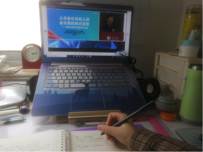 疫情防控战斗至今,一场没有硝烟的战争仍在持续,一个个生动的抗疫事例、烈士勇者都是一堂堂思政大课。4月23日14:30,由中共安徽省委宣传部、中共安徽省委教育工委、安徽省教育厅和人民网共联合举办的“同上一堂战‘疫’思政大课”安徽专场于云端开讲。18网新同学们一个个也都在屏幕前认真观看、学习。