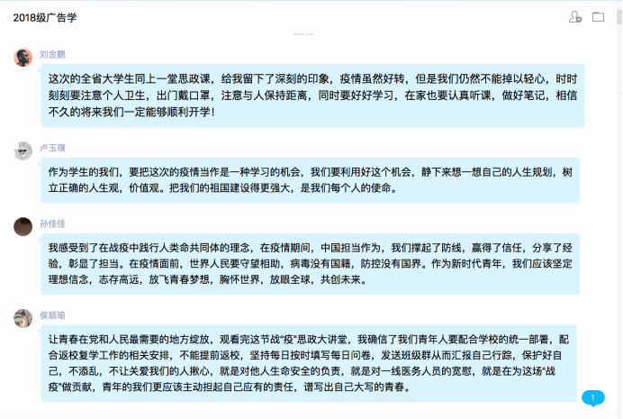 直播结束后,同学们反响热烈,2018级广告学的同学纷纷发表了学习体会。员工们从全国人民万众一心、携手抗疫中感受理想信念的力量;从医护人员的奉献和公民个体的自觉中明白小我与大我的关系;还有同学从专业角度出发,对新闻传播和舆论导向在抗疫中的作用进行了深入思考。(文/章子悦 周楠 图/周楠)