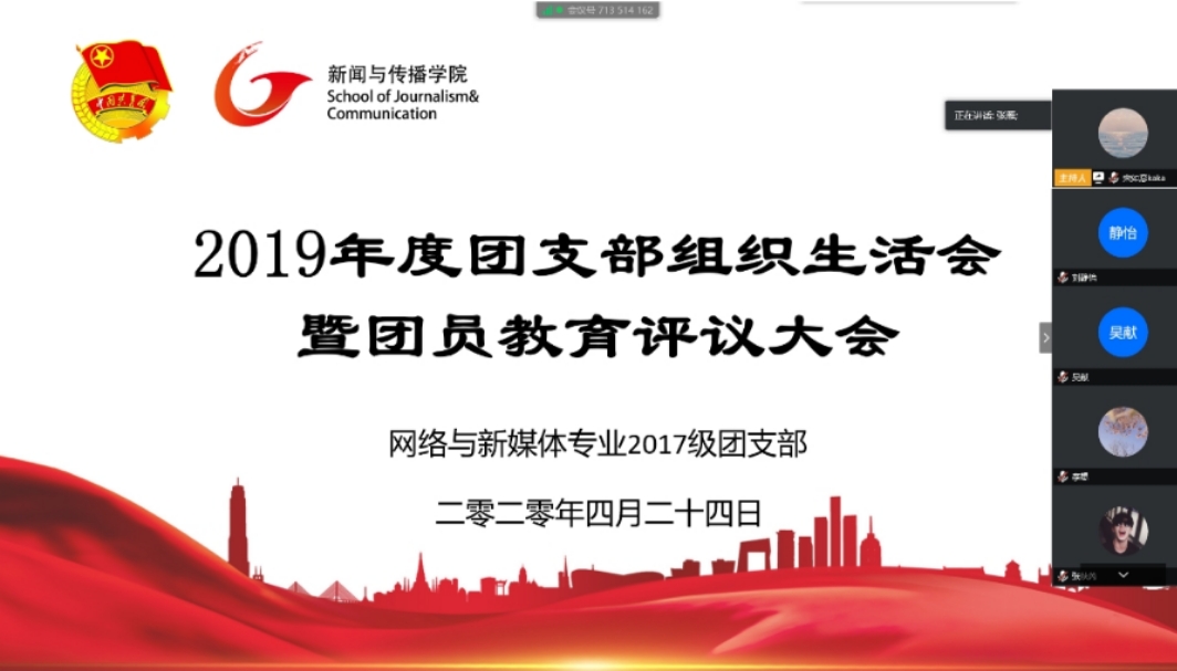 4月24日下午2:30,为落实2019年度团支部组织生活会暨团员教育评议工作,在公司团委的指导下,网络与新媒体专业2017级团支部召开了线上组织生活会。院团委书记张雁、院团委委员赵柳明以及全体团员参会。会议由团支书宋诗雨主持。