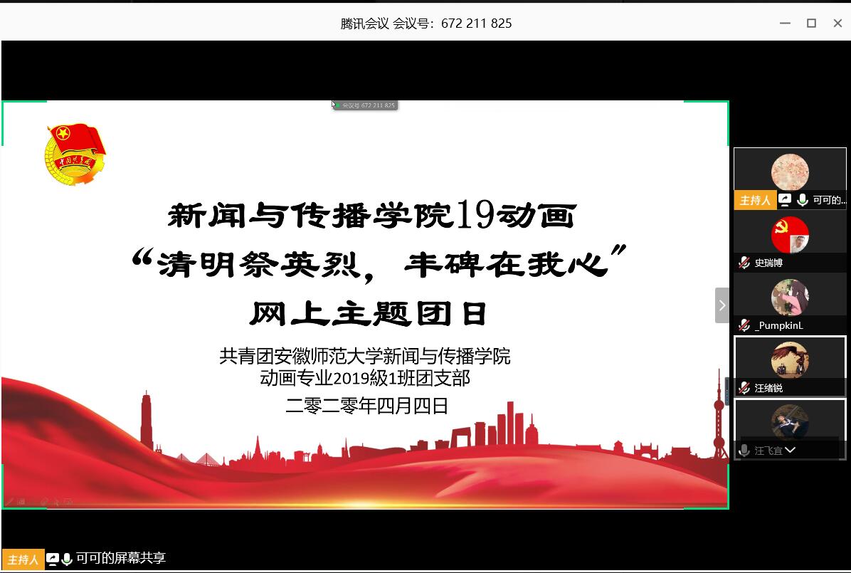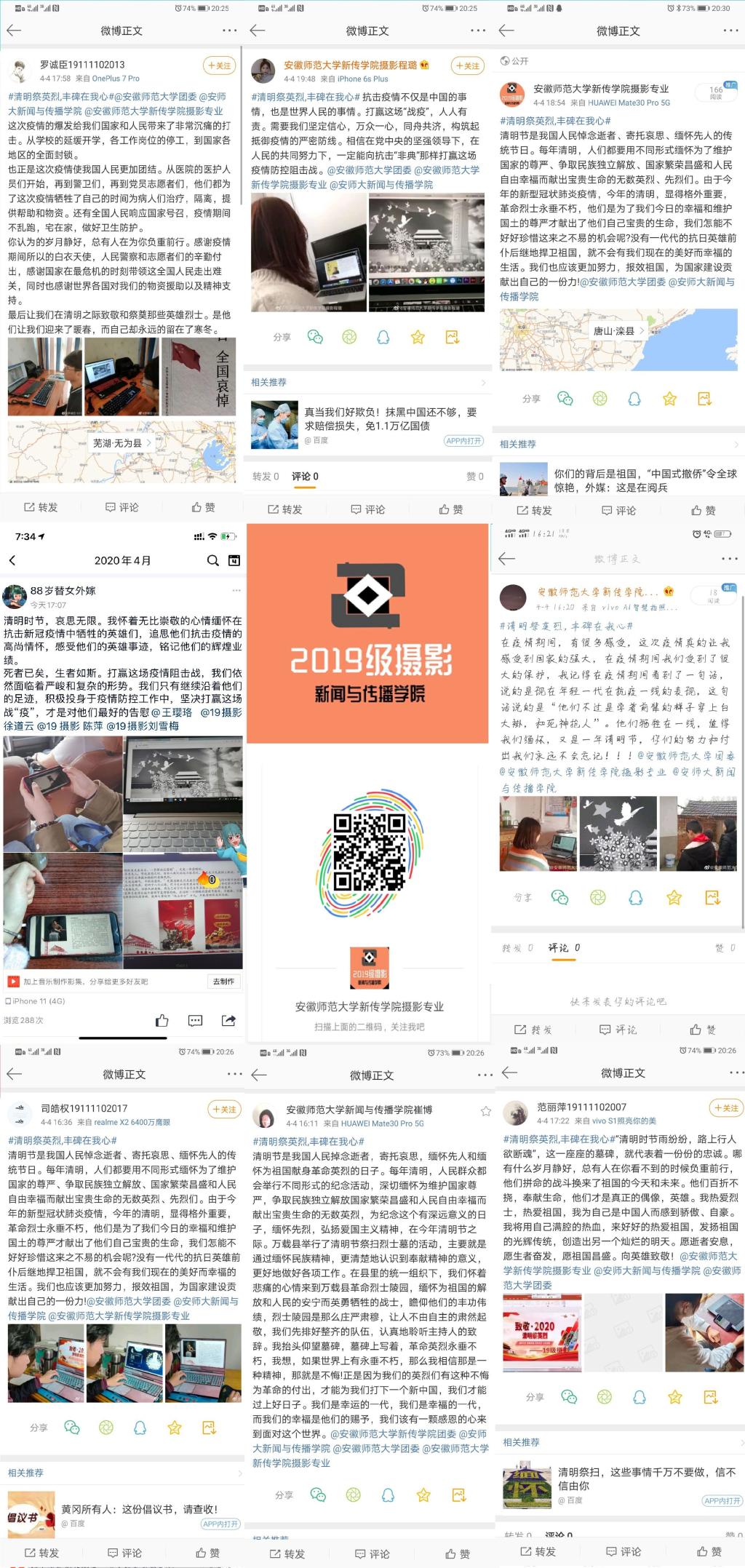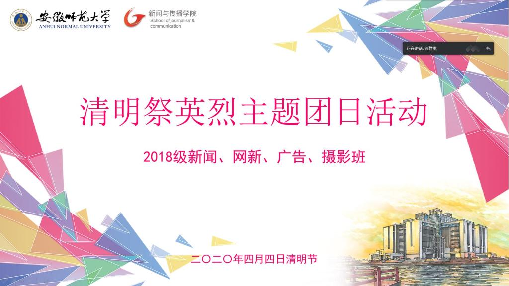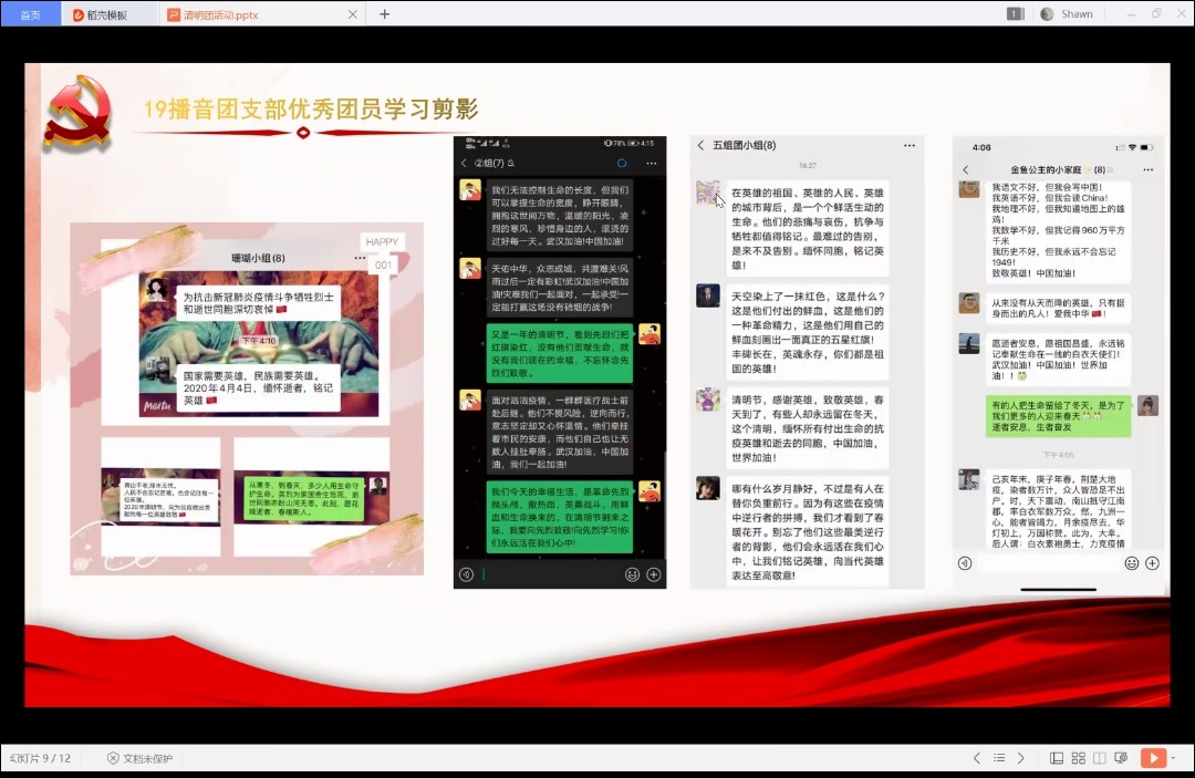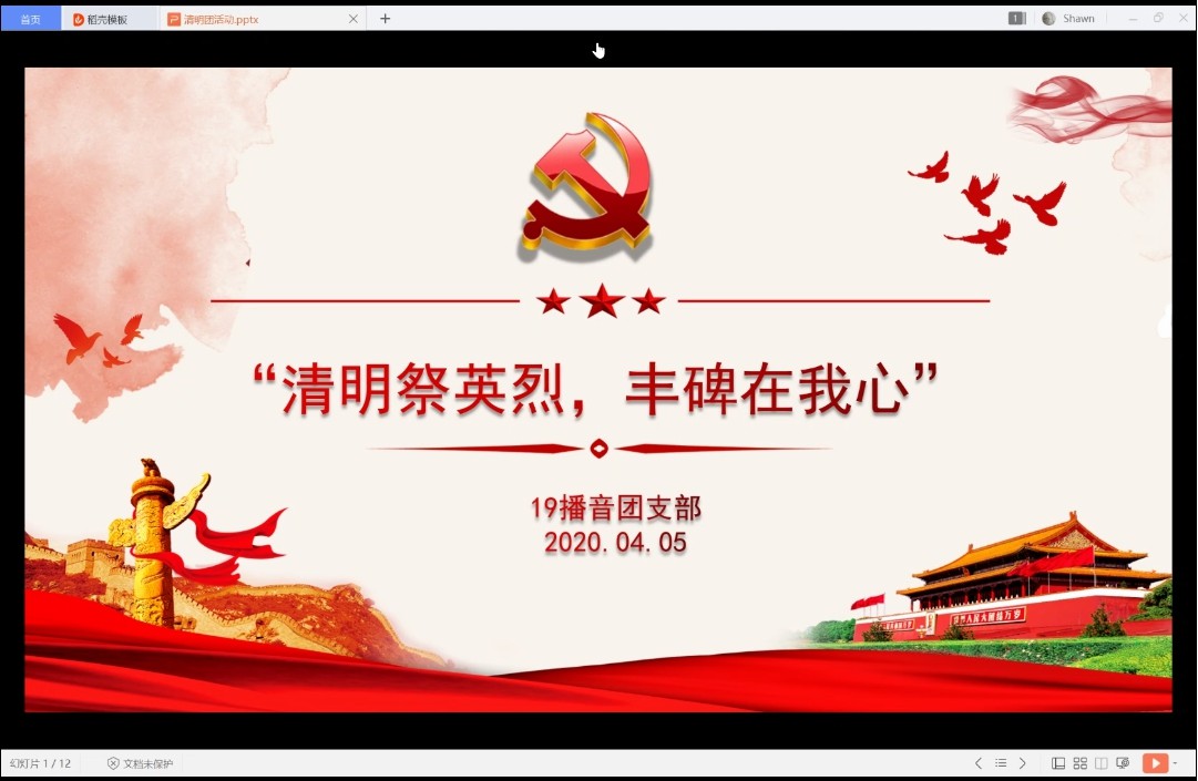 各团支部通过线上支部会议的形式让团员青年们共同缅怀英烈,共同观看英烈记录视频,团员代表以在线方式讲述动人的英烈故事,让同学们致敬英烈,铭记历史,不忘初心,砥砺前行。作为新传学子,部分班级的同学还通过各自的专业技能制作了抗疫宣传作品,包括海报、主题PPT、摄影作品、绘画作品等。另外,有部分班级通过写清明随笔的方式记录先烈事迹,开展主题团日活动。