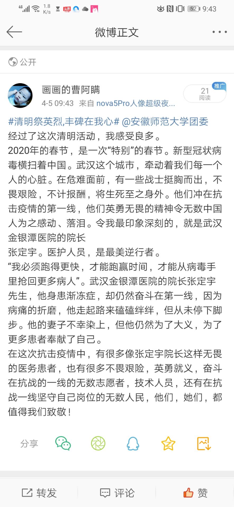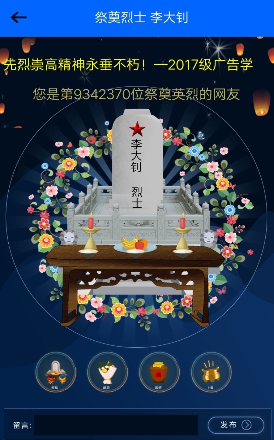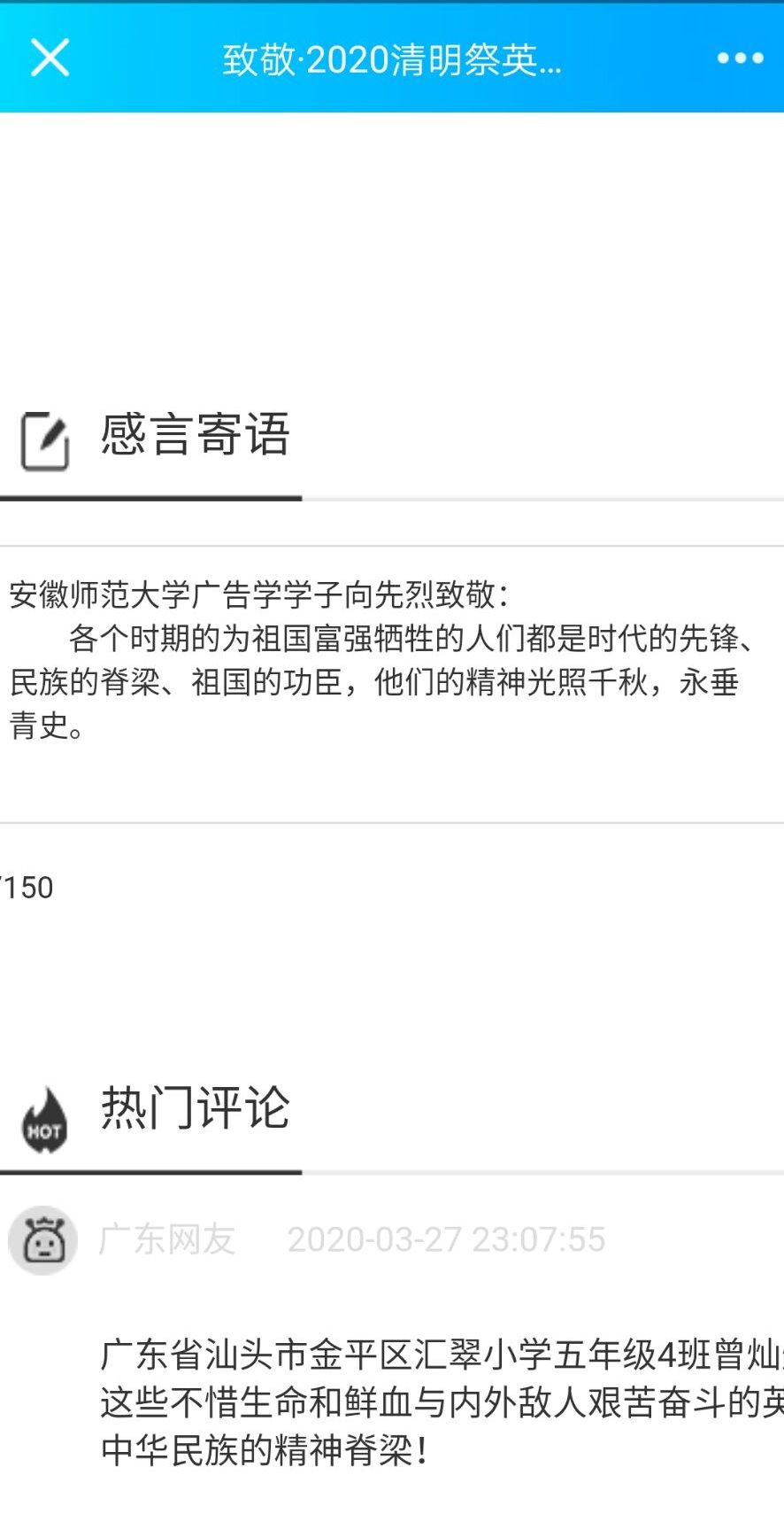 为向抗疫牺牲的英烈致敬,缅怀因疫情而牺牲的人民,各团支部广泛发动组织,积极营造氛围。一是鼓励同学们参加全国性的哀悼活动,在所在地默哀三分钟,表达对抗击新冠肺炎疫情斗争牺牲烈士和逝世同胞的深切哀悼。二是充分利用网络、微博、微信等新媒体平台,组织团员青年积极参与网上祭英烈活动。三是鼓励同学们登录中华英烈网“清明祭英烈”专栏开展”致敬2020清明祭英烈”为主题的网上祭扫英烈活动,学习革命先烈的英雄事迹和伟大精神,写下感言想法,学习新冠肺炎疫情防控牺牲烈士用生命守护生命、用生命践行生命、用生命书写担当的崇高精神,有效地扩大了活动覆盖面和影响力。