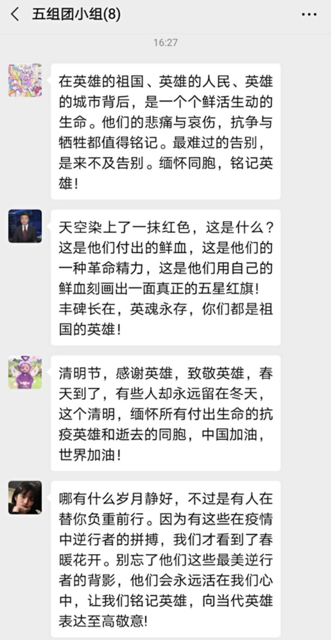 新传团员青年严格遵守不聚集、不扎堆、不聚餐的原则,将中华民族慎终追远的情感融入现代文明的表达方式,强化精神文化传承。部分团员青年登录“皖事通”APP开展清明“云祭祀”,避免开展实物祭扫。更有部分团员青年线下学习收看《这就是中国》第49期,并围绕新冠肺炎疫情防控、决胜脱贫攻坚以及抗日战争胜利75周年等主题挖掘英烈故事,与同学线上分享英烈事迹。