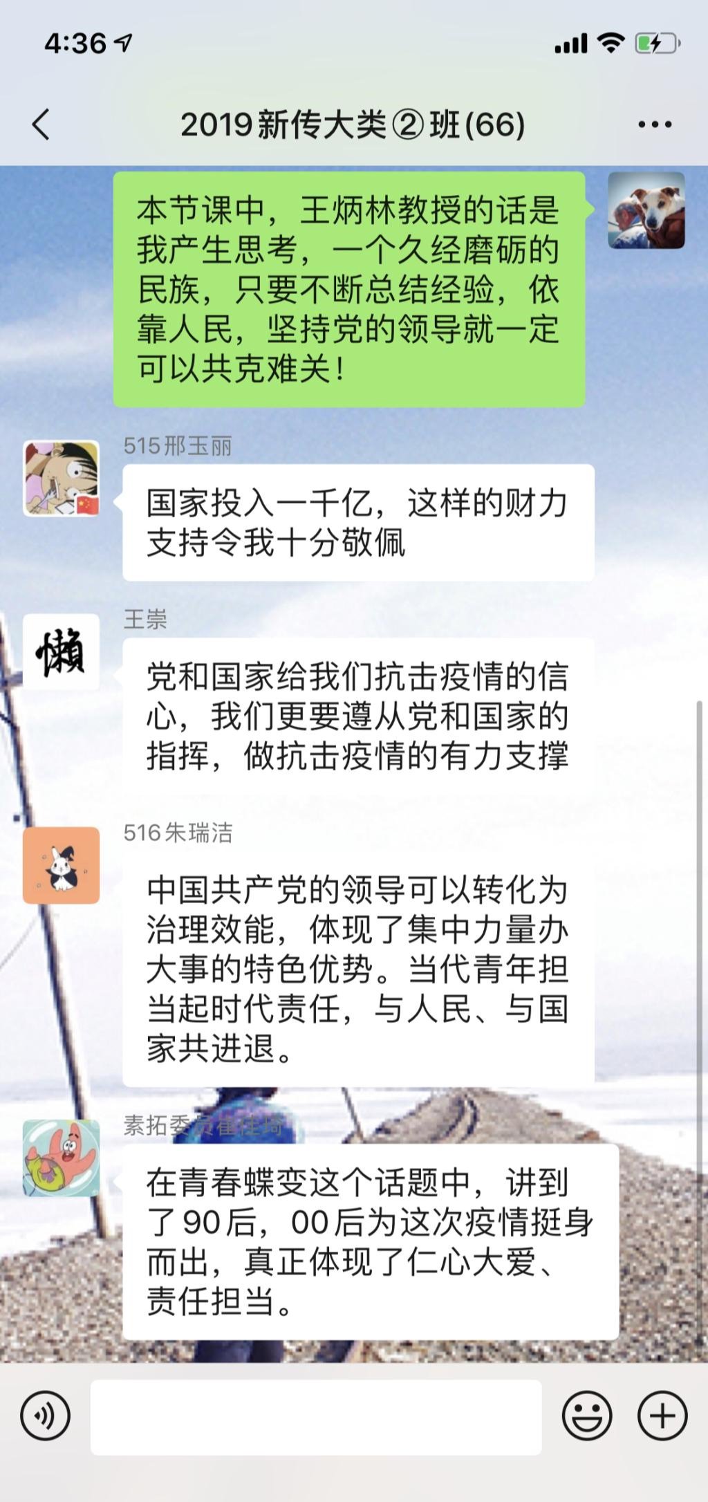 2019级新闻与传播大类杨洋:这个春节格外严峻冷清,但这个冬天却值得铭记,一切都是因为全国乃至全世界所正在面对的疫情大考。这堂课带领我重温了中国这两个多月的战斗历程,"士不可以不弘毅",我身为一个新中国当代老员工虽然不能像那些医护人员奔赴前线,但我看到了无数个与我同龄的"卖萌却也冲锋在前"新青年,泪眼崩溃后继续战斗,防护版"小天鹅",方舱版"萨日朗"等等无数个令人动容的画面,在中国陷入疫情的那一刻,我们这代人一夜长大,这场大考不会是新中国伟大复兴路上的唯一困难,但从这个冬天开始,我们懂得了守望相助,同舟共济,每个人心中有"生于种花家,何其荣幸"的温暖信念,从此艰难险阻我们还有何可惧怕!从在崖壁上、雪山上、方舱内收听网课不懈学习的同龄人中,我懂得了学习不应止步,大写的青春中应该把小我融入到国家的大我,肩有大任、胸有大志、手中有书才能用科学用知识救我们想救的人,去我们想去的远方。新时代的长征路上,我会用奋斗的青春将自己铸造成为有理想、有本领、有担当的时代新人!