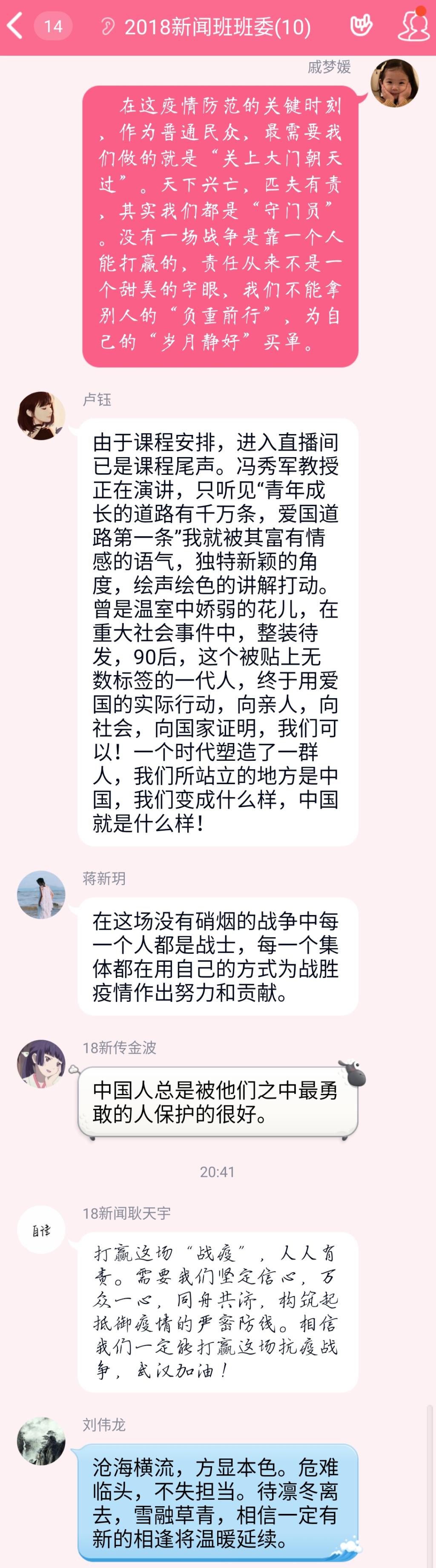 2018级新闻学专业韦韬瑞:先秦诗歌《诗经·秦风·无衣》里讲到,“岂曰无衣,与子同袍”,意思是说,不要以为没有人和你同路,我将与你同甘共苦。通过今天下午学习的疫情防控思政大课,我颇有触动。病毒肆虐,但谢谢你,陌生的人,虽然未曾谋面,可我们有同样的家园!中华民族经历过许许多多的磨难,但现今依然繁荣昌盛,因为有你们,让疫情的发展得到初步的控制,所以我们理应相信坚持信念就能找到光明,相信春天来时草木会吐新芽,相信每一个童话故事都有美好结局,相信世间美好能够和我们环环相扣!中国加油!为所有人祈福!