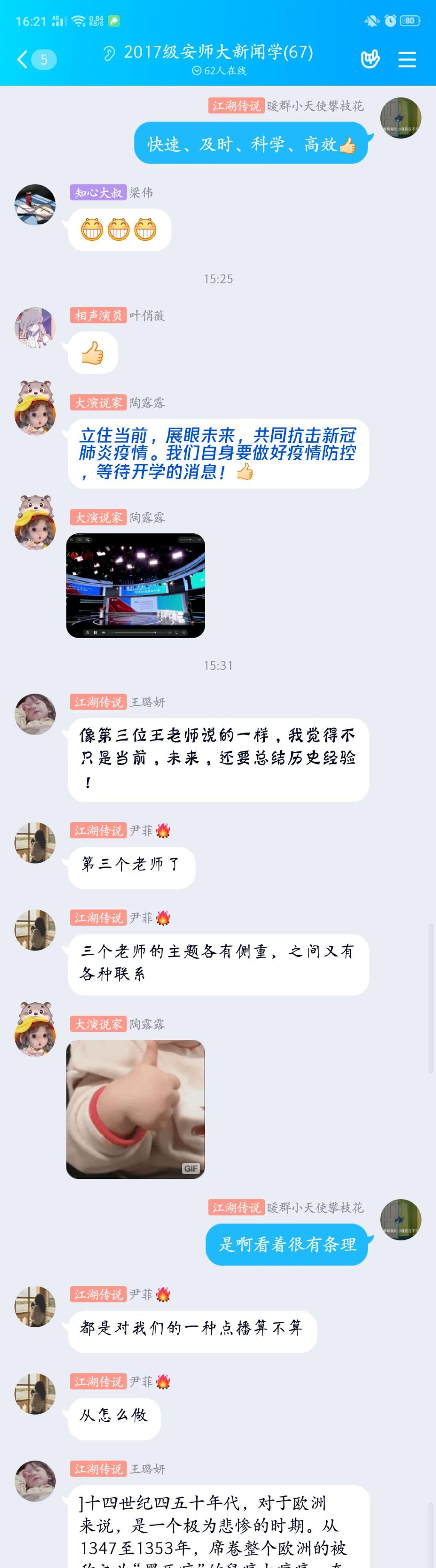 2018级新闻与传播专业研究生冯晓敏:在这场疫情防控中,我能够感受到社会主义集中力量办大事的优势,社会各界纷纷投入到疫情防控中,其中也有许多普通党员的身影。作为一名员工党员,我们应该努力贡献自己的一份力量,不信谣不传谣,不为社会增加负担。在家也要制定好学习计划,学习不止步。就如这堂课上所说,新时代青年要肩有大任,要勤学奋斗、增长才干,才能用科学精神和专业本领保护我们想保护的人。