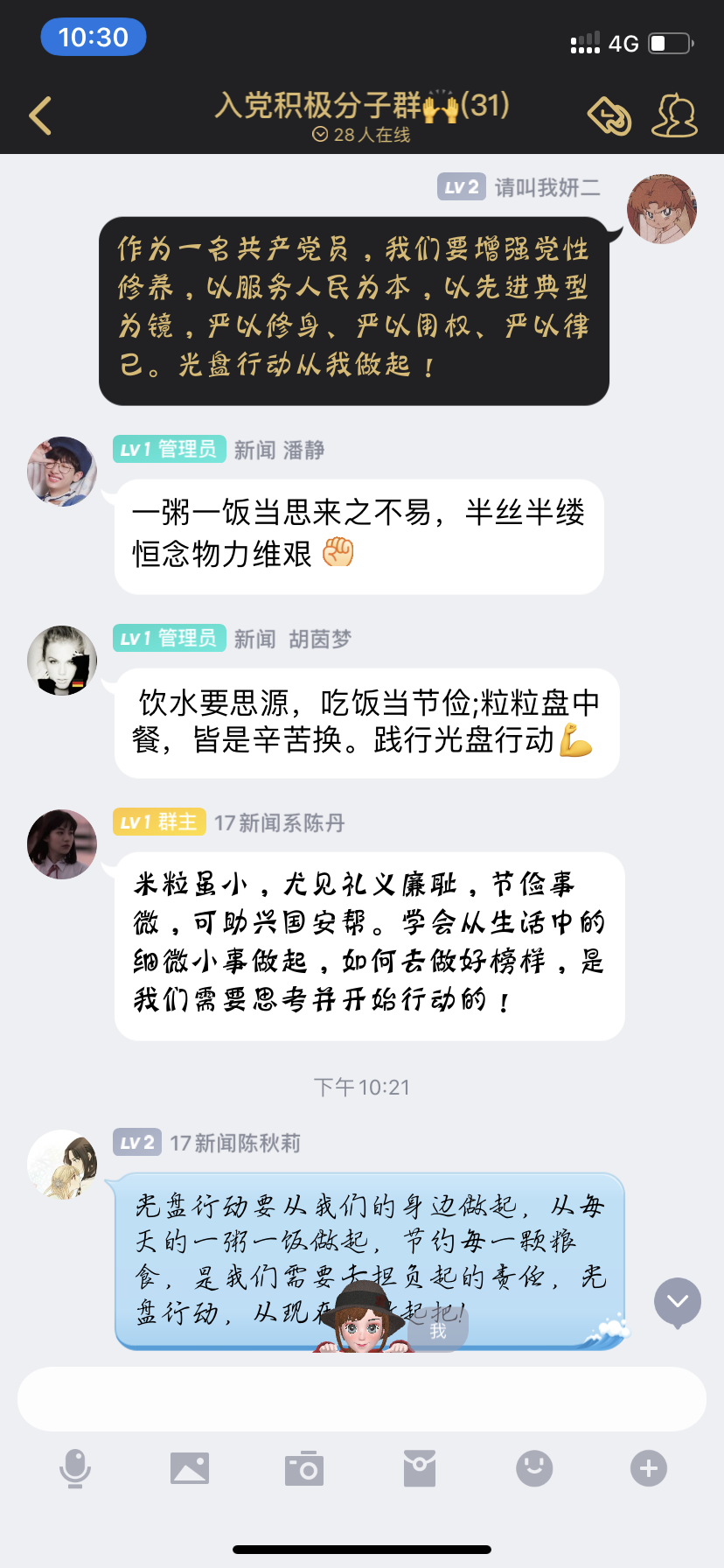 2019级新闻学专业张小雨:勤俭节约是中华民族的传统美德。节约粮食不仅是自身良好素质的体现,也是社会道德的制约。爱护珍惜粮食,一粥一饭当思来之不易。光盘行动的践行有助于社会主义精神文明的建设,作为老员工,更应该践行。