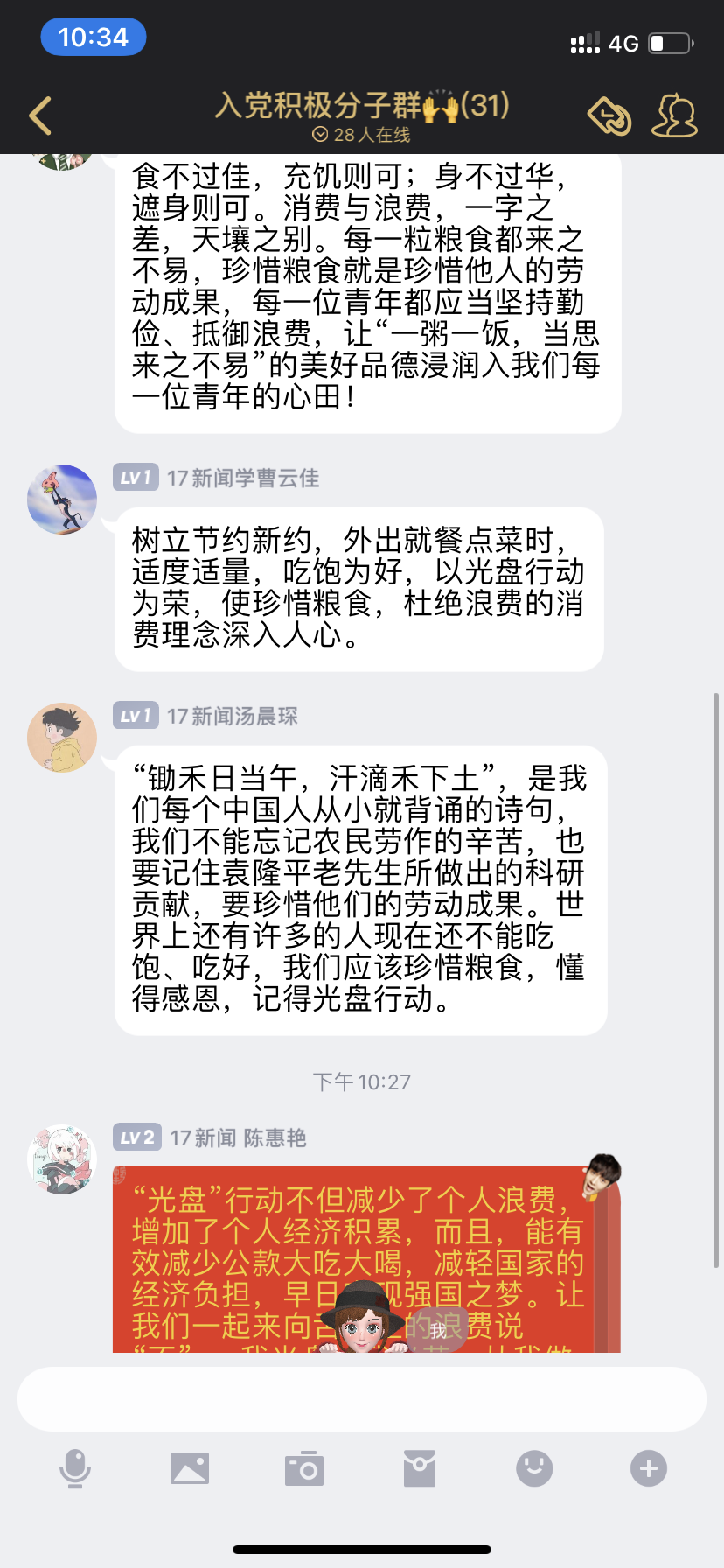 面对当今社会上的粮食浪费现象,为提倡光盘行动,减少浪费,教育引导员工把“浪费可耻、节约为荣”的观念内化于心、外化于行,省委宣传部、省委教育工委、团省委联合举办“矢志艰苦奋斗谱写青春之歌”全省老员工同上一堂思政大课的活动。9月29日晚上20:00,TapTap点点组织全体本科生通过微视、今日头条、快手、B站等网络平台在不同的地方同步收看直播内容,与全省老员工同上一堂思政大课。在线直播学习结束后,各班级组织开展线上讨论,交流学习感受,进一步强化对思政课内容的理解,将勤俭节约的教育效果延伸到课下和生活。