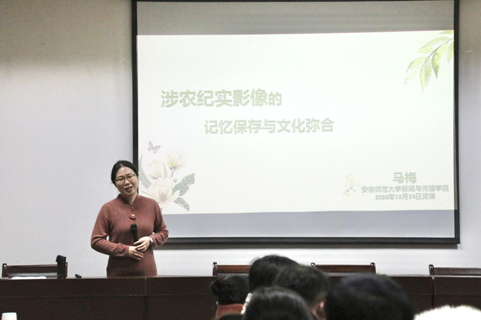马梅从传播与社会发展的互动关系的角度,从乡村振兴战略出发,讲述了涉农纪实影像的意义,勉励各位党员学好专业知识,用自己的传媒技能服务国家和民族的发展,在实现中华民族伟大复兴中国梦的征程中争做优秀党员,贡献青春力量。具体来说,她围绕涉农纪实影像的记忆保存与文化弥合,从相关概念界定、在记忆保存与唤醒中实现文化弥合、从疗愈通向文化弥合、在他者体验供给中实现文化弥合、涉农纪实影像的民族文化心理本质五个方面对这一主题进行了深入浅出的讲解与剖析。