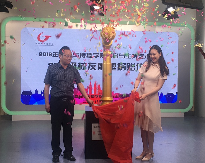 分享会的最后,举行了金话筒雕塑捐赠仪式。据悉,2014届播音与主持艺术为该专业首届毕业生,饮其流者怀其源,仅30人的“黄埔一期”,毕业四年仍深深地惦念着母校,全班同学在校庆之际向母校捐赠“金话筒”塑像一座,李梦醒向公司捐赠图书《校园市场——布局未来消费群 决战年轻人市场》100本,以感念师恩、激励后学。杨柏岭代表全院师生对播音系员工的返校表示了热烈欢迎,员工们毕业多年仍心系母校、回馈母校,令他感动不已。最后,在现场全体师生的共同见证下,杨柏岭和2014届员工代表李梦醒共同为金话筒雕塑揭幕。